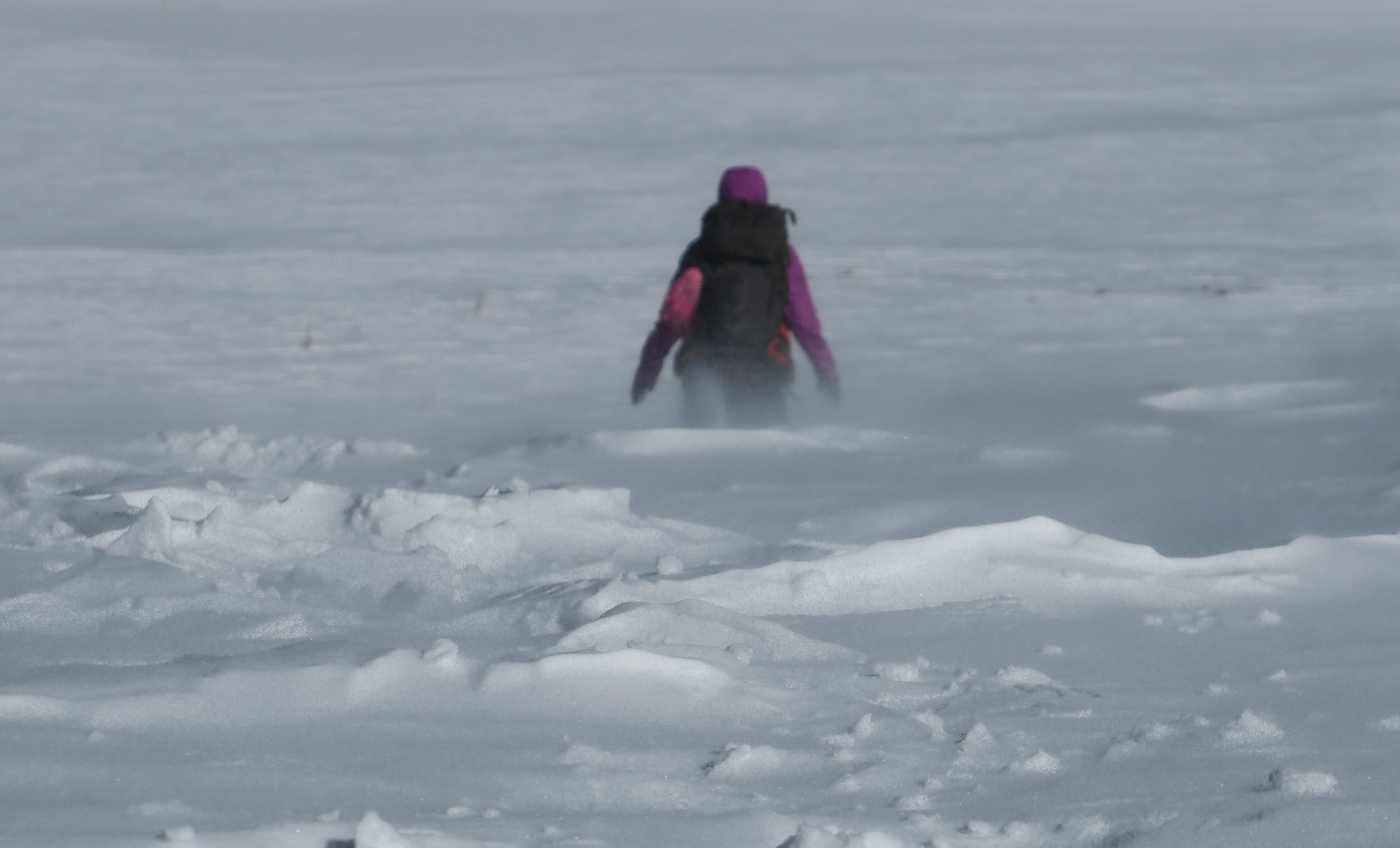 We made good time walking the last uphill mile to the trailhead, but the snow on the path through the trees was knee deep even in snowshoes. Stacy and I took turns breaking trail, the leader slogging at a snail’s pace for ten or twenty minutes before stepping aside to catch her breath in the new leader’s tracks. We reached treeline at mid-morning and looked across a rolling plain of snow packed into patterns and pushed into cornices on the ridge tops. The sky was clear, and the wind swirled little tufts of snow along the surface. I knew those mountains in the summer, but they were different in the winter, like a friend I struggled to recognize when she wore a wig and showed up unexpectedly.